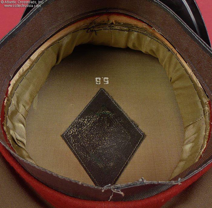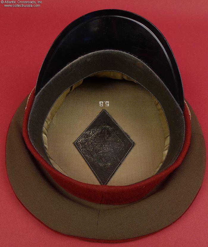 The crown is in olive drab gabardine with maroon band and piping. Includes original gold filigree chin strap cord and service officer cockade. The lettering on the sweat diamond is unreadable. Size 56 (US 7, Medium) is stamped in white underneath.
