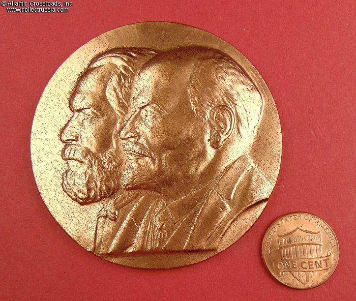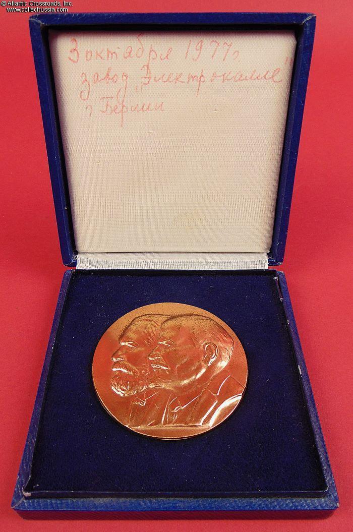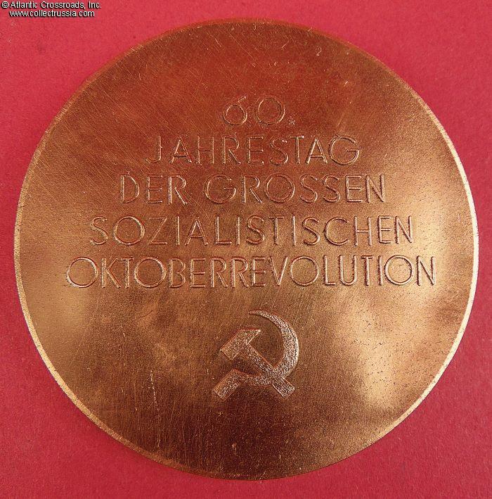In bronze, measures 63 mm wide, weighs 92.5 g. The obverse shows well-sculpted raised bas-relief portraits of Lenin and Marx; the reverse is inscribed with "60 YEARS TO THE GREAT OCTOBER SOCIALIST REVOLUTION". The inscription rests on the hammer-and-sickle emblem of the USSR Communist Party.