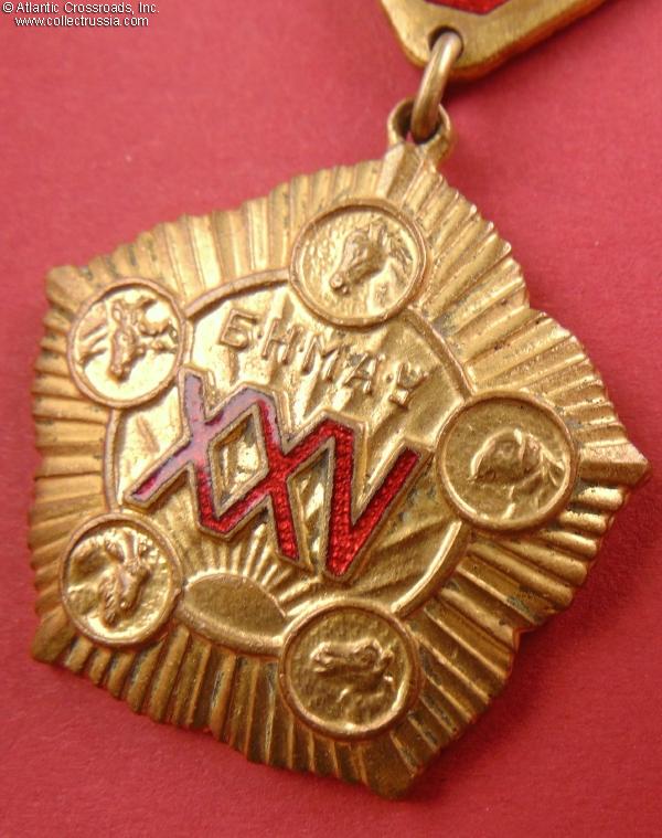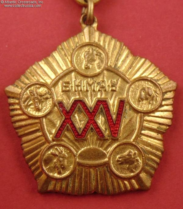 In gilded brass and enamels, heavy construction. Medallion measures 41.6 mm in height incl. eyelet, 39.8 mm in width. Stamped serial number to the reverse. Variation 2 featuring relatively thin numerals "XXV", although the reverse is as concave as the first version. Excellent quality, similar to that of Mongolian Victory over Japan Medal.