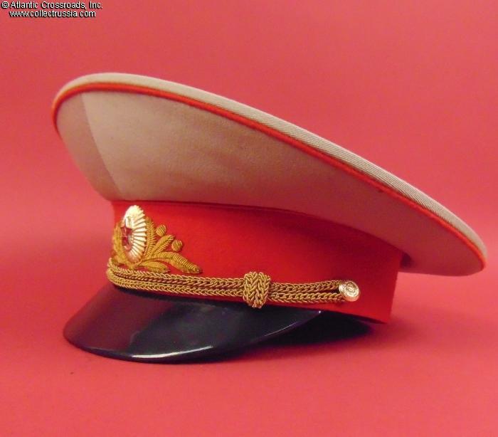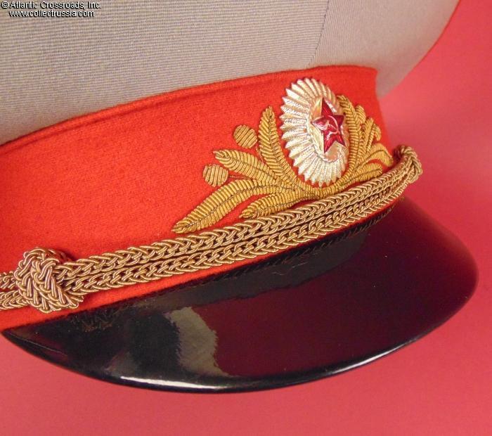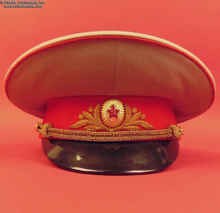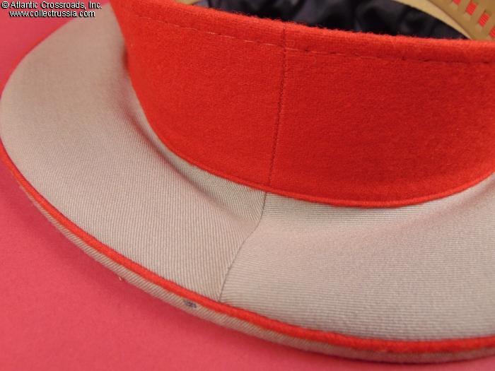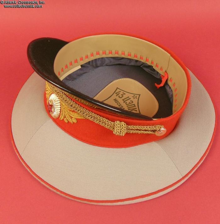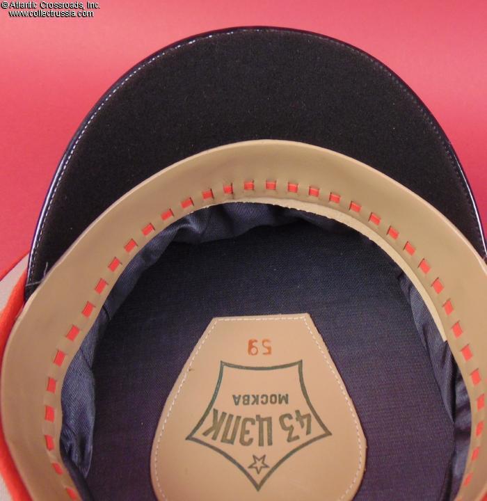 In light gray wool gabardine with red piping and band, gold embroidery on the band, and gold filigree chin cord. Features characteristically large "oversized" crown. Red silk tape threads through the leather sweatband to allow a customized fit, a feature unique to general officer hats. The two-piece hat badge is also the type specific to generals. The leather sweat shield shows the logo of the Moscow TsEPK Factory of the Ministry of Defense without the date of manufacture, as typical of the general officer hats produced after 1987. The label is marked 59 for size (equivalent of