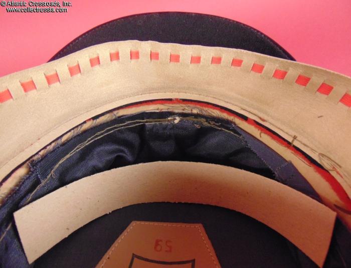 The hat is in very good to excellent condition. Both the interior and exterior are very clean, although there are a few minor faint discoloration spots at the top of the crown that are visible only at a close inspection The gray wool of the crown is free of the usual significant moth damage and has only a couple of tiny moth nips near the piping, both of them so inconspicuous that they would be practically unnoticeable when the hat is displayed. The red band and piping are perfect. The patent leather visor is pristine. The gold embroidery is likewise perfectly preserved and tight, without any loose strands.