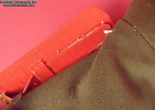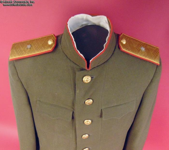 The tunic is in napped olive-green wool of characteristically fine early quality. Features stand-up collar and internal breast pockets with flaps, and red piping on the collar and cuffs. Shoulder boards are in gold bullion embroidery with embroidered silver stars. The front buttons are of WW2 type, all of them in gilded brass and with 11 scrolls in the Soviet national emblem representing the number of Soviet republics (the type used from 1937-1946); most of the buttons have the Moshtamp stamp on the reverse without a date, as standard for WW2- vintage buttons, while one has an unmarked back painted olive-drab. The hollow-back shoulder board buttons are likewise a WW2 eleven- republic version. The liner is in fine satin fabric; the internal breast pocket is lined in sturdy grey cotton. The neck liner is in white cotton.