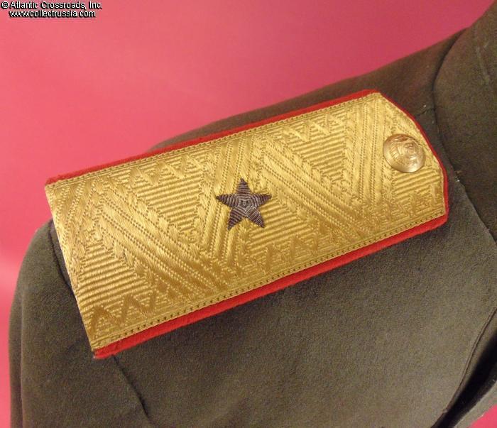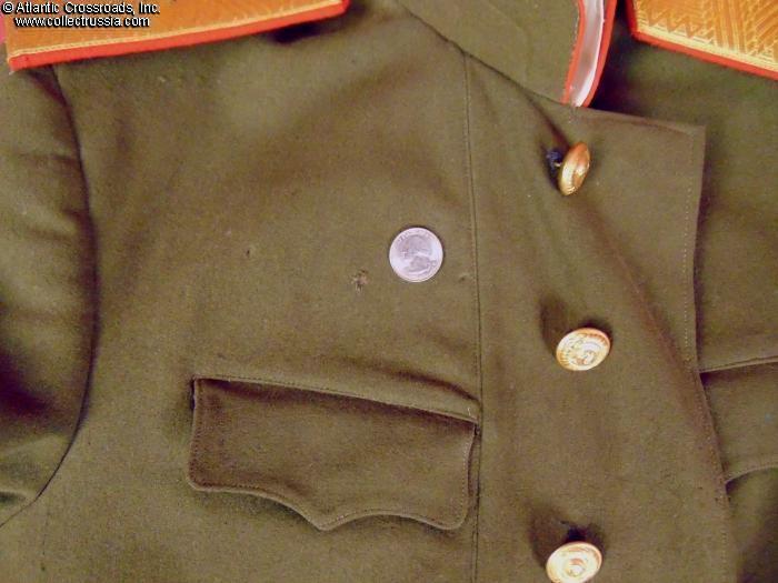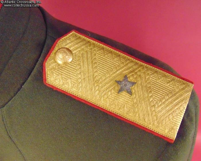 The tunic is in napped olive-green wool of characteristically fine early quality. Features stand-up collar and internal breast pockets with flaps, and red piping on the collar and cuffs. Shoulder boards are in gold bullion embroidery with embroidered silver stars. The front buttons are of WW2 type, all of them in gilded brass and with 11 scrolls in the Soviet national emblem representing the number of Soviet republics (the type used from 1937-1946); most of the buttons have the Moshtamp stamp on the reverse without a date, as standard for WW2- vintage buttons, while one has an un