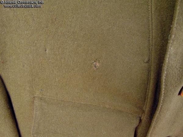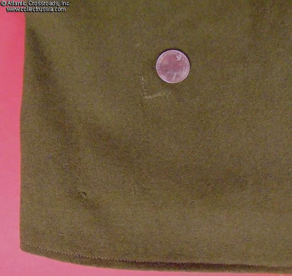 In very good condition, outstanding for a Soviet military uniform of the WW2 era. Both the wool outer material and red piping are completely free of significant mothing, heavy soiling or major wear of any kind. There is a single very small (approx. ½") area of discoloration at the front between the two upper buttons, which is not too noticeable. Minor moth tracks are on the nap of the wool on the back, but the tunic is completely free of moth holes or bites?which is quite uncommon for a Soviet WW2-era garment made of wool. There are two tiny, less than one- inch-wide areas on the back about 5" from the bottom hem where torn original outer fabric was carefully resewn in place. The repair was done so professionally that it's only noticeable upon close inspection under bright light. Additionally, faint green stains on the back blend so well with the olive drab wool that they are almost invisible at a regular viewing distance and certainly do not detract from the tunic's appearance under normal lighting conditions.