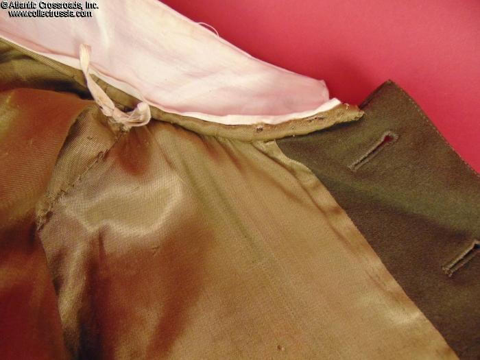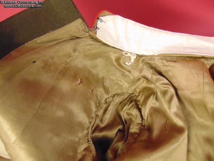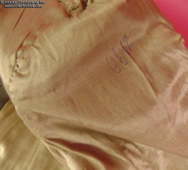The liner shows minor wear and a couple of faint stains but is overall clean and sound. The chest has several holes from decorations worn by the original owner; however, none are conspicuous when viewed from the front. There is a numeral "OO2314" inscribed in blue ink at the inside pocket opening on the liner, possibly an inventory number. Just below it is a two-line inscription in ink; only the first word, "Kuchinskiy," is clearly legible?likely the owner's name. Additionally, there is an inscription "6612" on the inside right sleeve liner, apparently a tailor's mark. The shoulder boards have some moth bites on the felt underside but the gold uppers and piping are perfect.