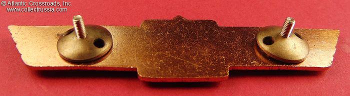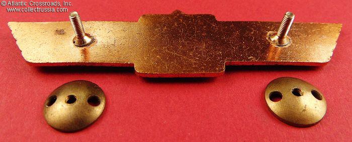 In brass and paint, 2-part construction with the fighter jet resembling the Soviet MIG-15 superimposed on the centerpiece. Two screwback attachments to the reverse.