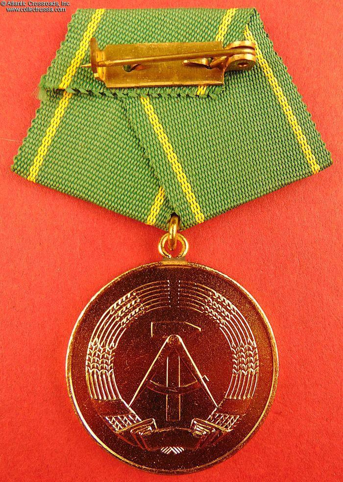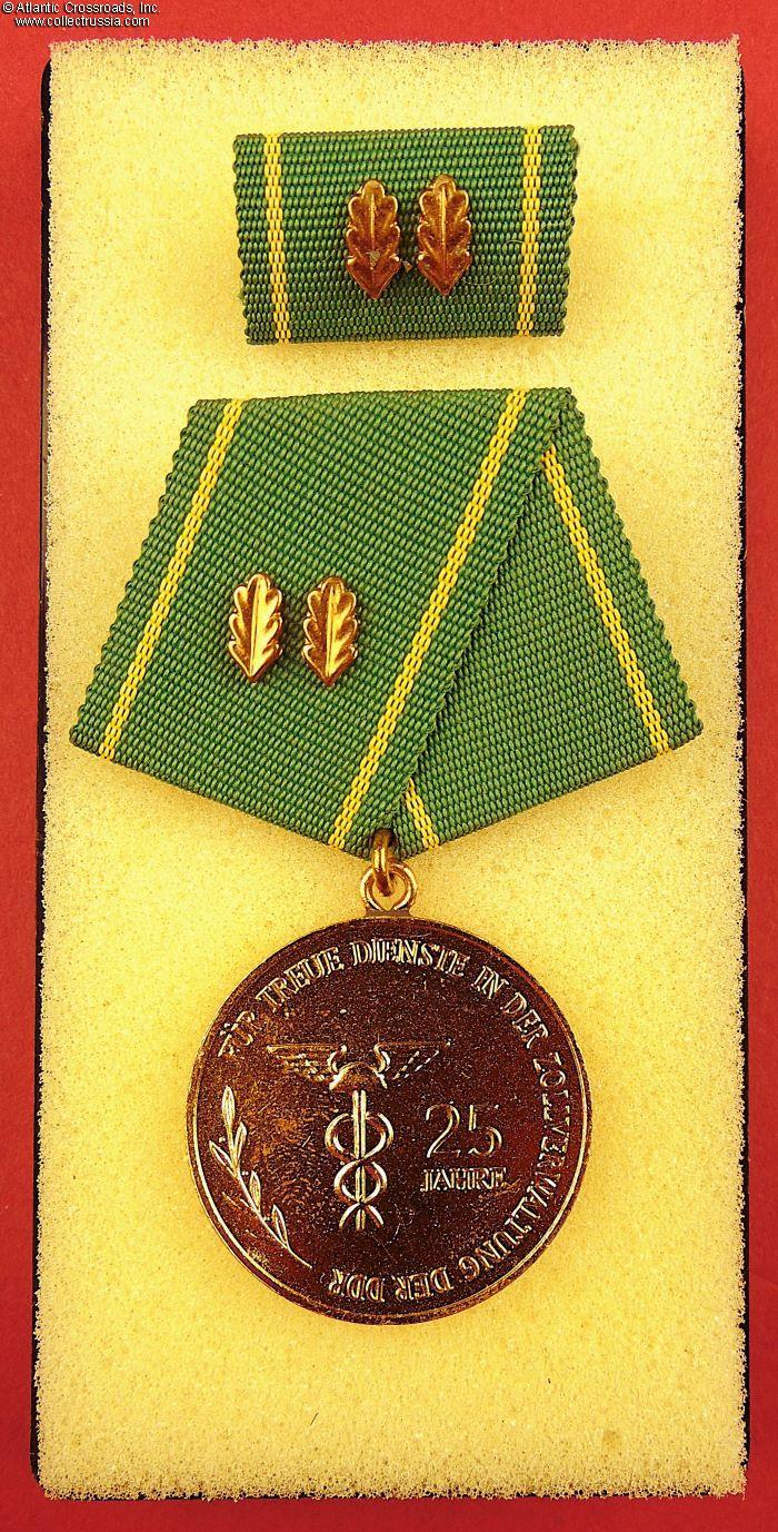 Brass gilt, measures 32 mm wide. The name of the medal, "Medaille für treue Dienste in der Zollverwaltung der DDR," and the number of years in service are struck on the obverse. Two gold oak leaves on the suspension ribbon signify 25 years of service. The presentation case has black plastic bottom lined with light foam rubber inside, the lid is in Plexiglas.