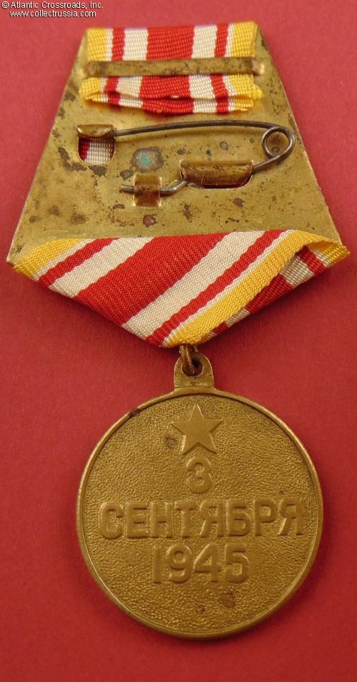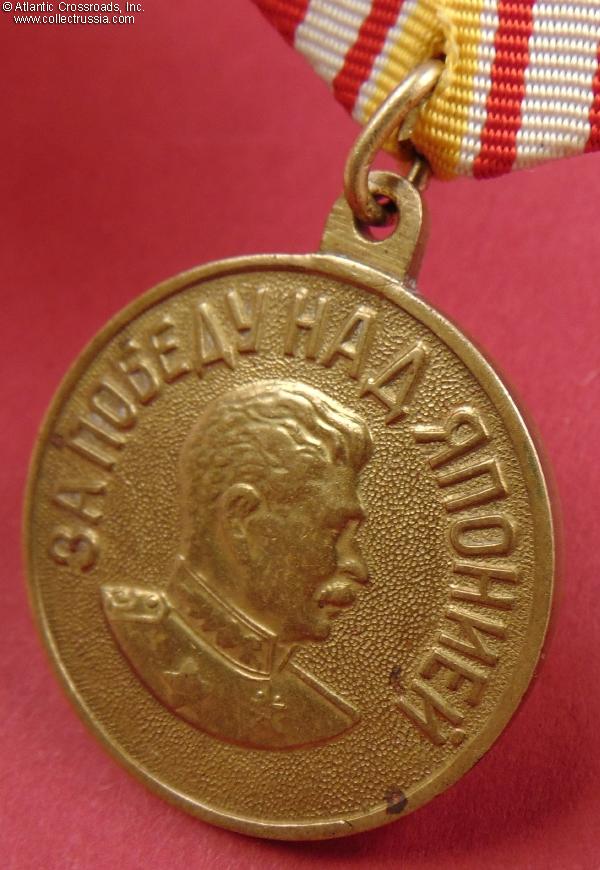 Comes on original suspension device, a single-layer model in brass. The ribbon is relatively new (from original old Soviet stock). The connecting link appears to be of the period. Overall, an attractive example of the Victory over Japan Medal.