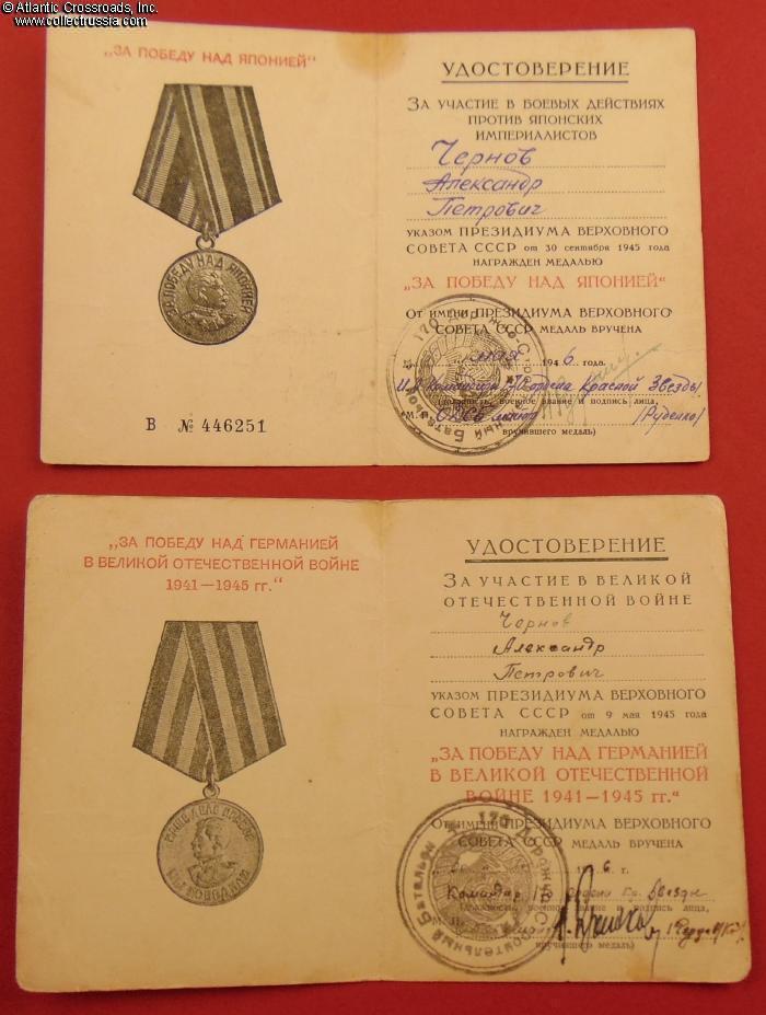 Award Certificate for the Medal for Victory over Japan, Series "B" #446251, issued on 1 May 1946. Shows an ink stamp of the 170th Order of the Red Star Road Construction Battalion and hand-signed by its temporary commander Major Rudenko.