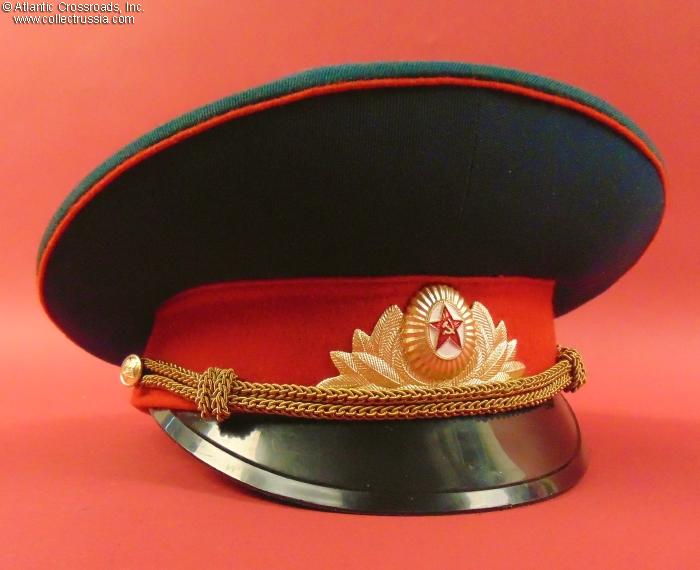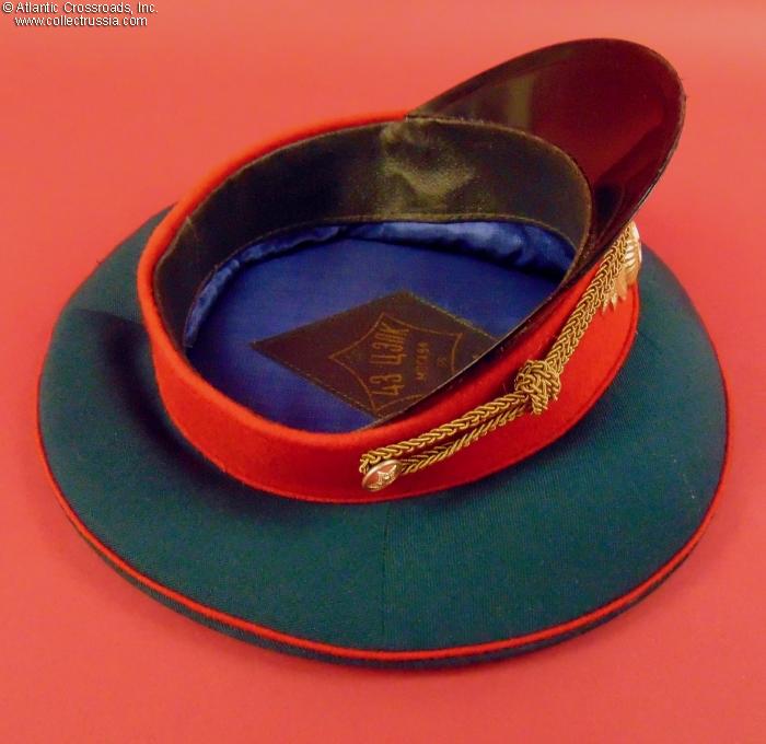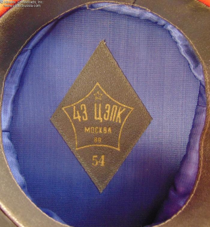 The crown is in wave-blue wool blend gabardine with a red velvet band and piping. Includes the original chin cord in gold filigree and the correct full-dress officer cockade. The sweat diamond of the TsEPK Military Garment Factory in Moscow shows a 1988 date of manufacture and Size 54 (US size 6 ¾ / Small). There is a factory quality control stamp on the underside of the sweat band.