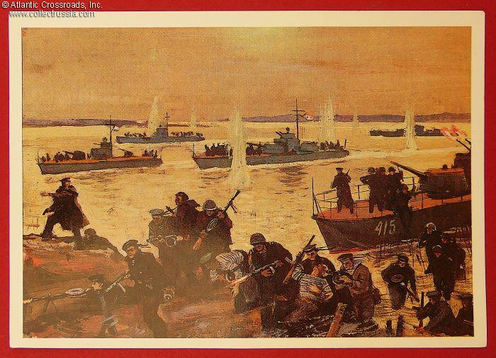 The size is continental standard 6" x 4", unmailable without a cover; published by the Visual Arts Publishing House, circulation 100,000. The postcard is #10 in a set showcasing the Soviet Navy during the Patriotic War. The annotation on the reverse is a brief informational about the heroism of the Azov flotilla sailors and the role they played during the September-October 1943 battles that led to liberation of the Taman Peninsula. The artwork is an artist's rendition of the scene. The artist's name, V. Pechatin, is printed at the bottom on the reverse.