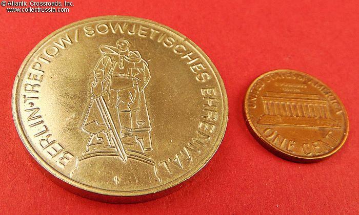In nickel-copper alloy with silver-colored coating, measures 36 mm wide. The raised inscription encircling the sculpture on the obverse reads "Berlin, Treptower Park, Soviet Memorial."