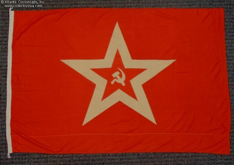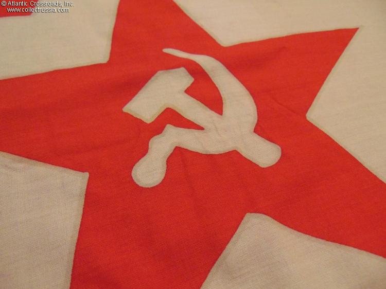 Large size, 79" x 50"(approx. 6 ½' x 4 ¼'). Features red field with a large "cut-out" star and hammer and sickle. The canvas hoist sleeve shows a round quality control stamp; the designation "Gyuis" (i.e. "Bow [Flag]", "GOST" manufacturing standard code of 1981; the name of the manufacturer, Vladimirskaya Factory; and the 1989 date of manufacture.