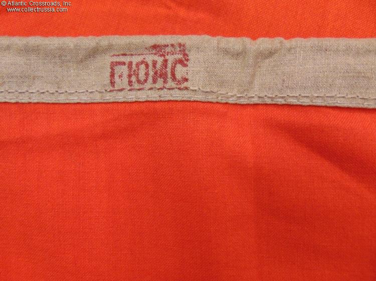 This type of flag was raised on the bow of Soviet warships of the 1st or 2nd rate when the ship was in port. It could also be used as the flag of a naval fortress, but considering the rather large size of this particular flag, it was probably intended for a large warship.