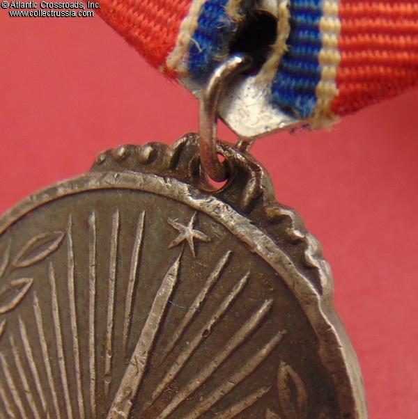 The suspension has been replaced with a later-vintage Soviet suspension in aluminum. The ribbon is for a completely different Soviet medal but its color scheme resembles the original Korean ribbon, so the Soviet recipient apparently deemed it a close enough substitute.