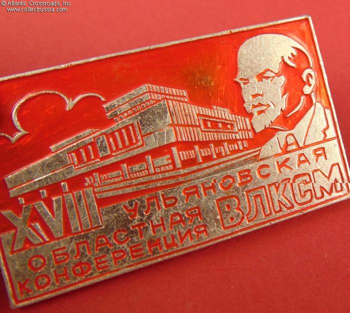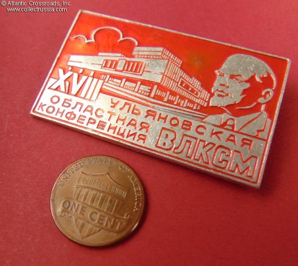 Aluminum, "cold" enamels; 30.1 x 50.4 mm. The badge is larger and features far more elaborate artwork than typical VLKSM conference badges of the period, likely due to the significance of the city of Ulyanovsk (formerly Simbirsk) as Lenin's birthplace. Excellent condition.