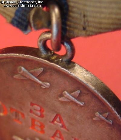 The medal comes on an original suspension, a WW2 two-layer model in steel with a self-locking pin. The ribbon is old, probably original to the medal; it shows minimal amount of soiling and fraying on the edges, but is still very attractive. The connecting link appears to be original; its ends are still joined with solder.