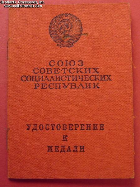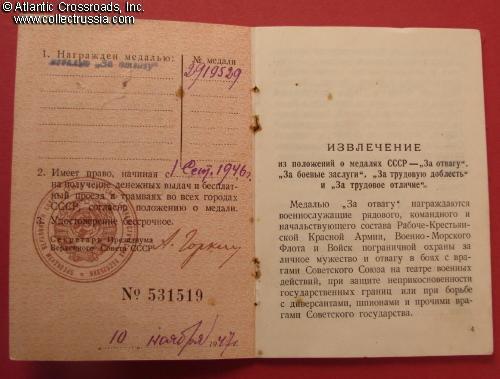 Medal for Valor, Type 2 Variation 1, #2919529, with award document, awarded on 6 August 1946 to Private Nikita Prokopenko.