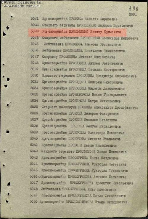 Research Materials: photocopy of the award commendation and relevant pages of the award decree. Additional information is available in the Vol. IX Red Tide of the C. Sharp's Soviet Order of Battle, World War II series. According to various Internet sources, the 1262nd Rifle Regiment took severe losses in July 1942, when it bore the brunt of massive air strikes and panzer attacks during the German Operation Seidlitz. In September 1943, the regiment was almost completely wiped out in the heavy fighting on the Pronya River bridgehead following the liberation of Smolensk, and its commander and all of his staff were killed in action. Although grievously wounded, Prokopenko was relatively "lucky" considering what would happen to his unit over the course of the following year and a half.