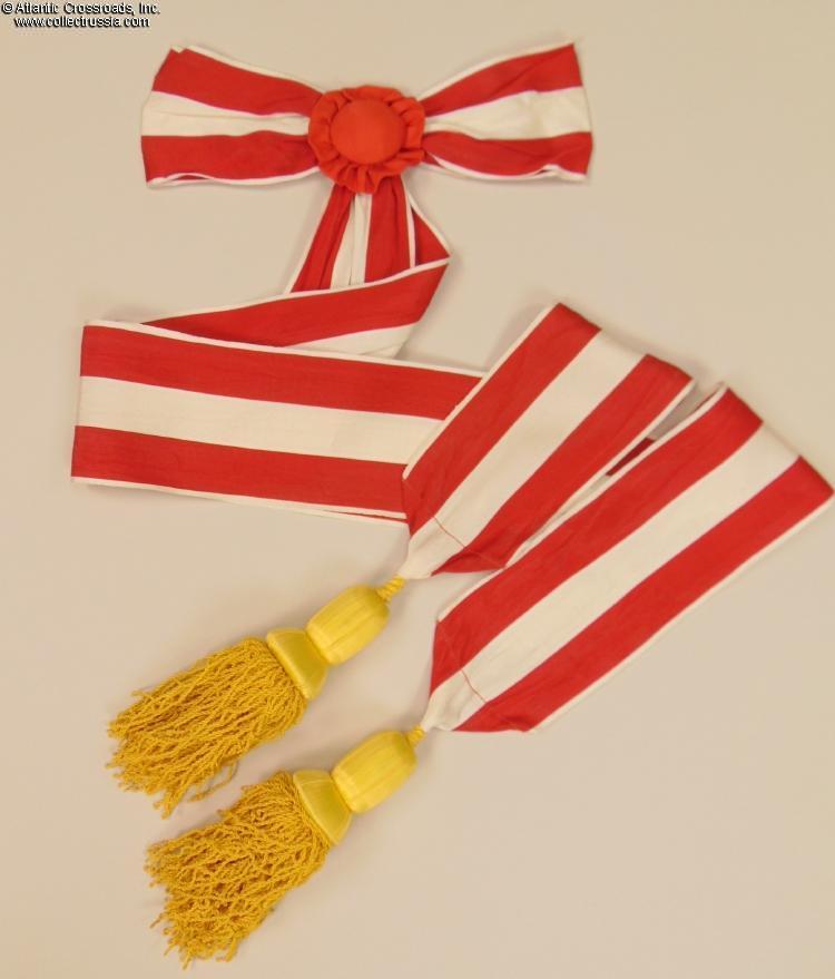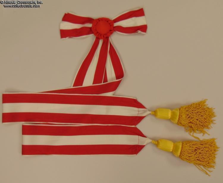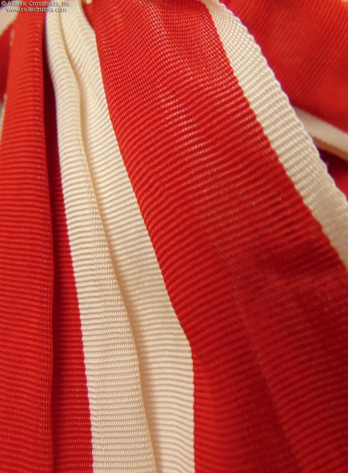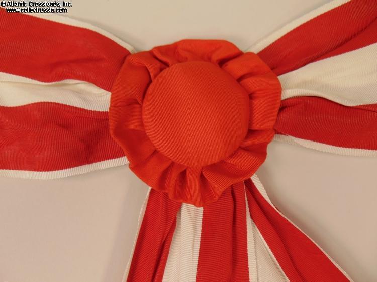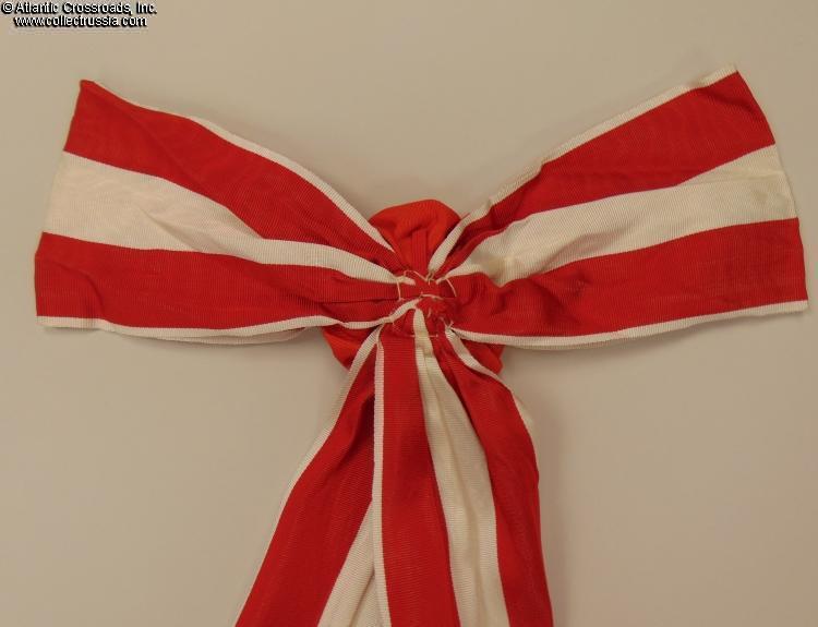 In high-quality red moiré silk with white stripes, approx. 4" in length. The set is complete, including the appropriate rosette and tassels.