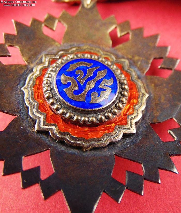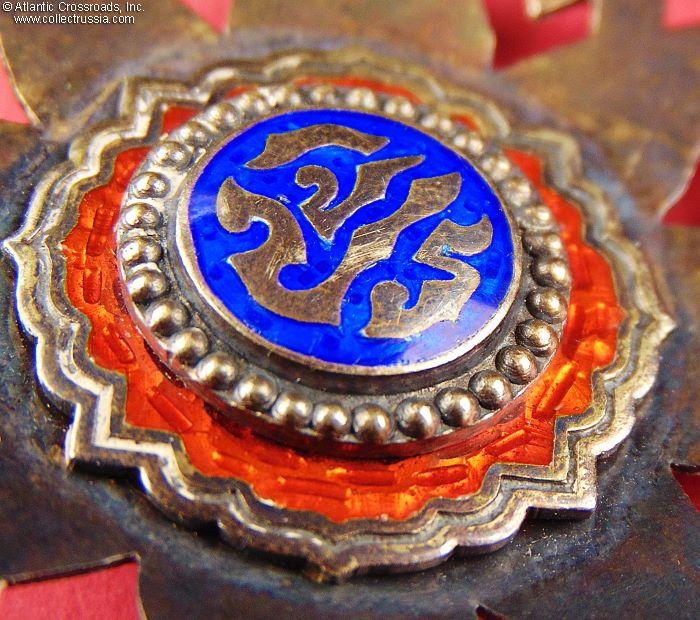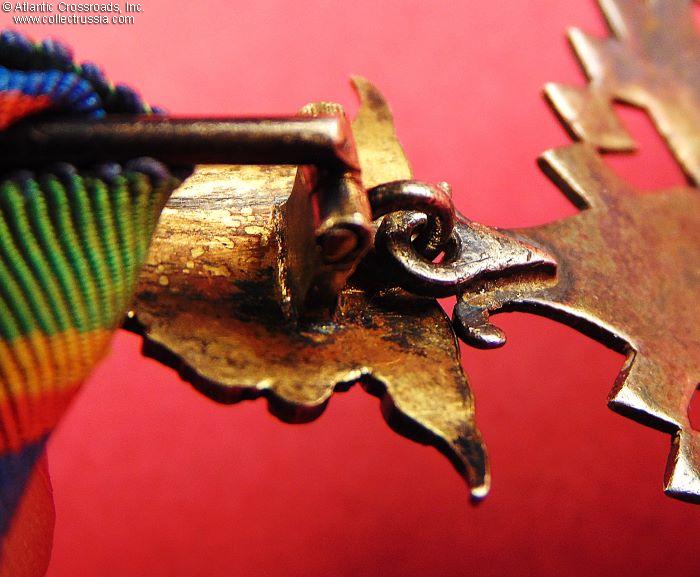 In very fine to excellent condition: the only imperfection visible to the naked eye is missing blue enamel to the right of the crown in the obverse center medallion. However, at x10 magnification, it looks like a manufacturing imperfection, not wear. The neck ribbon appears to be of the period, possibly original, showing minor discoloration due to light exposure and a couple of tiny catches to the silk