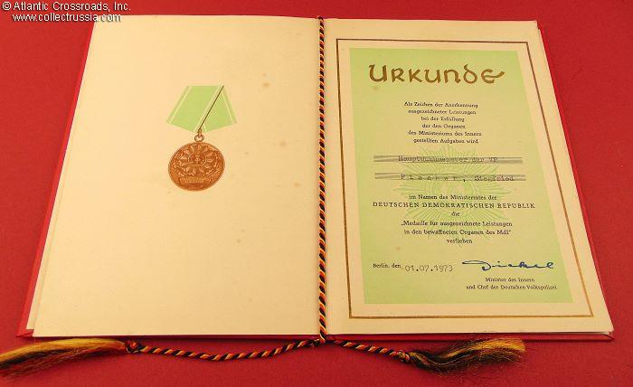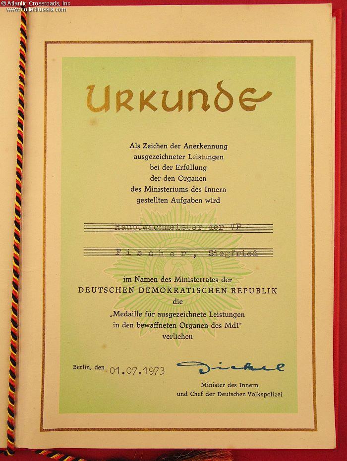 Presentation folder measuring 6" x 8 ½" when closed, in leatherette-bound hard cover with the DDR state emblem embossed on the front cover in gold. The cord holding the document is in the colors of the German flag. Inside, the left page has a color image of the medal. The award page on the right states that, as a token of recognition of outstanding achievements in the fulfillment of the tasks assigned to the organs of the Ministry of the Interior, the Council of Ministers of the German Democratic Republic awards Chief Constable Siegfried Fischer with the Medal for Excellence in the Armed Organs of the MdI (Ministry of Interior). The document is dated 1 July 1973 and bears a facsimile signature of the Minister of the Interior and Chief of German Volkspolizei (People's Police).