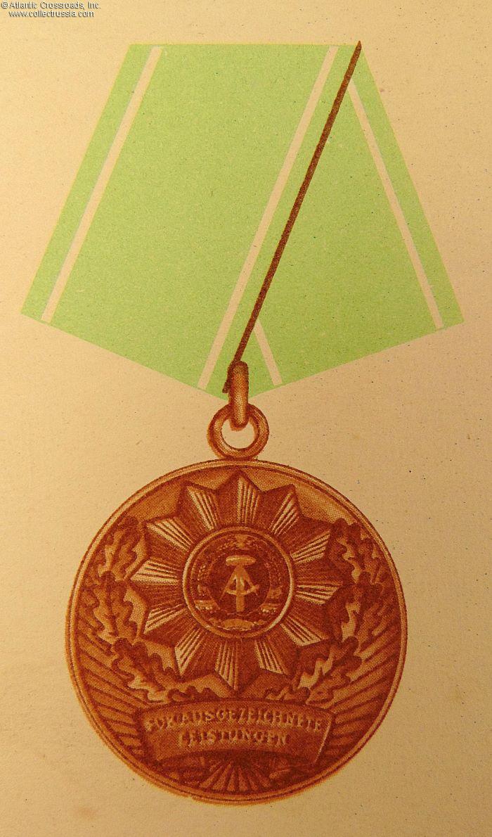 The medal (original name "Medaille für ausgezeichnete Leistungen in den bewaffneten Organen des Ministeriums des Innern") was instituted on 4 June 1959, in single class. Awarded for excellent performance of tasks directed at strengthening and consolidation of the DDR.