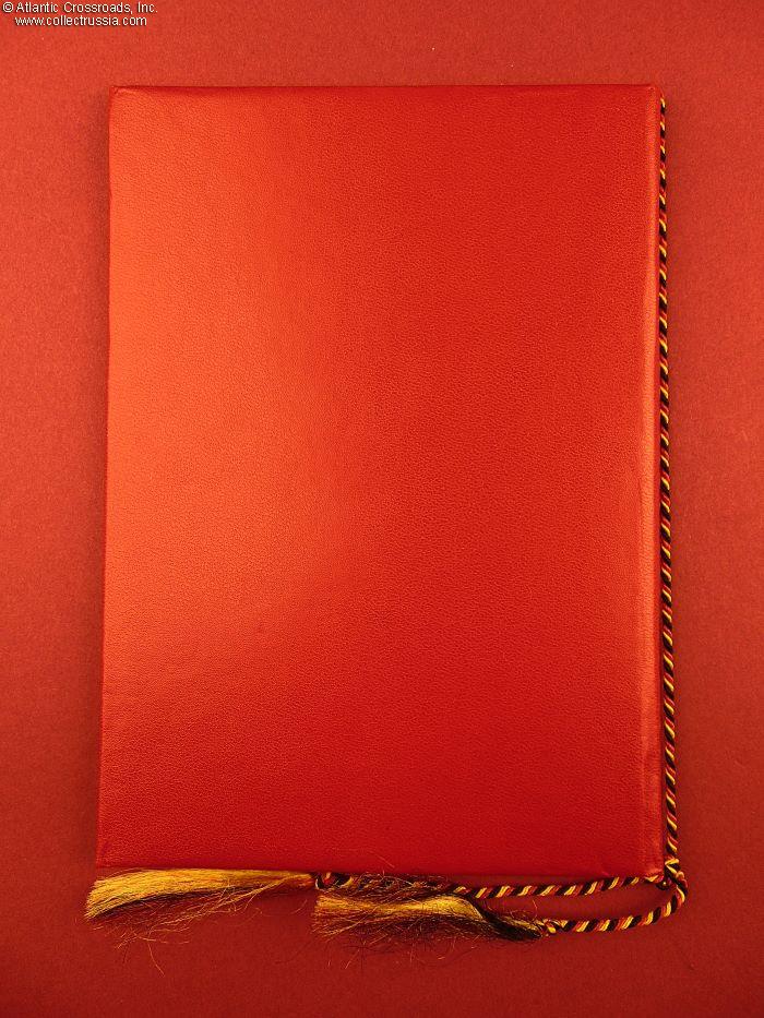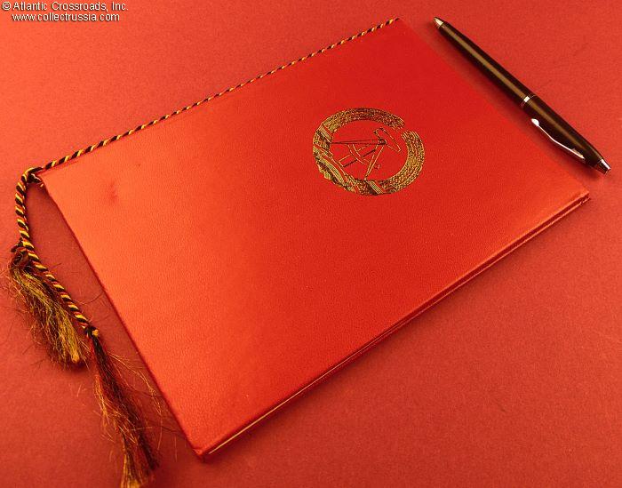 Presentation folder measuring 6" x 8 ½" when closed, in leatherette-bound hard cover with the DDR state emblem embossed on the front cover in gold. The cord holding the document is in the colors of the German flag. Inside, the left page has a color image of the medal. The award page on the right states that, as a token of recognition of outstanding achievements in the fulfillment of the tasks assigned to the organs of the Ministry of the Interior, the Council of Ministers of the German Democratic Republic awards Chief Constable Siegfried Fischer with the Medal for Excellence in the Arme