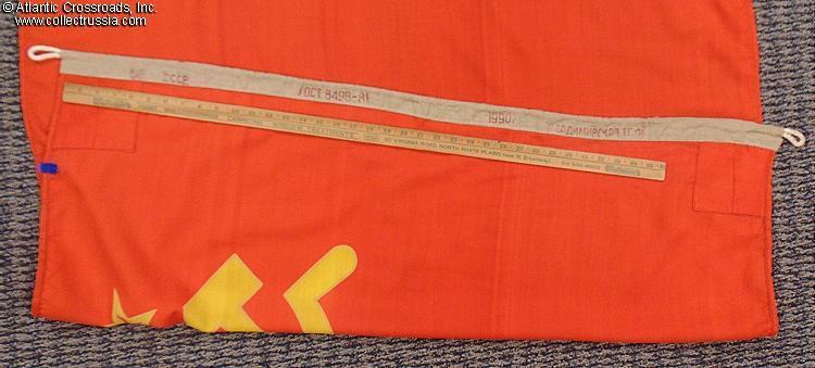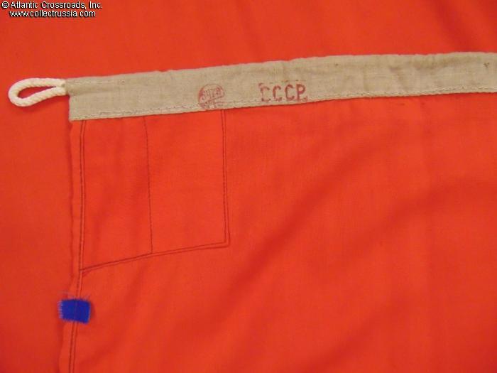 In wool bunting. Large size, measures 91" x 44" (approx. 7 2/3 x 3 2/3 feet). A sleeve of rough unbleached canvas holds the nylon rope for attaching the flag to a line on the mast. Flags of this type were made specifically for maritime use, the same exact design as used by the Soviet Navy. The lettering on the hoist sleeve shows a round factory quality control mark, identification CCCP ("USSR"), the state standard manufacturing code (ГОСТ), a 1990 year of manufacture, and the name of the factory, Vladimirskaya T.G.F.