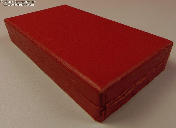 The presentation case is in thick pressed cardboard laminated in leather-textured paper. The size is approx. 6x3x1 cm. The fitted space for the medal and ribbon bar is lined with burgundy short-nap velvet. The lid is lined with light fabric.