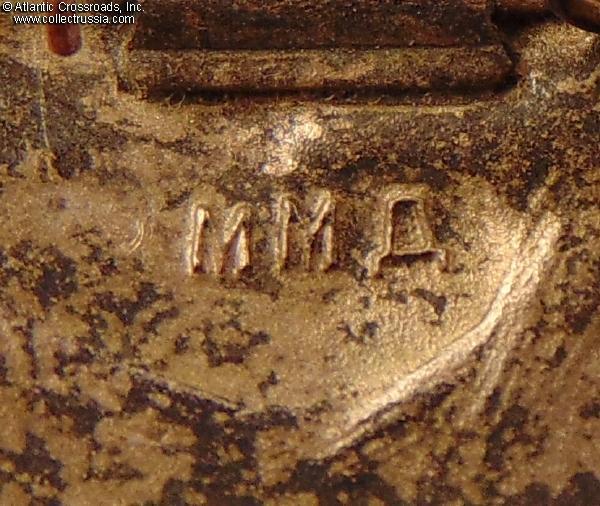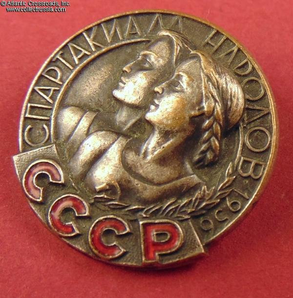 Silver-plated brass, enamels; measures 20.8 mm in height, 20.5 mm in width. Raised mint mark "MMD" to the reverse. A peculiarity of the artwork of this badge is a very "Germanic" (Arian?) features of the male and female athletes - one could almost suspect that they came off of a WW2 Nazi propaganda poster or badge! This was undoubtedly spotted and reported to the powers that be, so the badges of the later spartakiadas, although otherwise similar in design, have far more "Russian-looking" athletes. Another curiosity is the tiny hammer and sickle emblem perched on the breast of the girl - not to be found on the later issues.