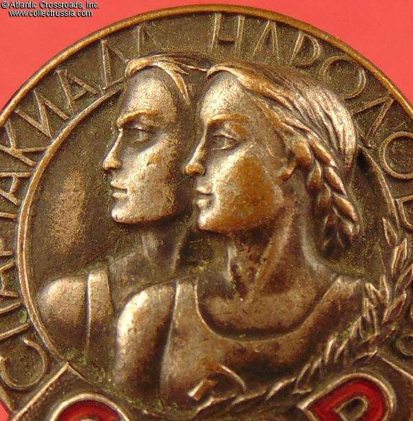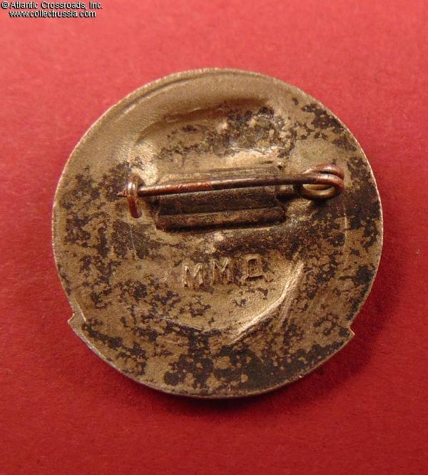 Silver-plated brass, enamels; measures 20.8 mm in height, 20.5 mm in width. Raised mint mark "MMD" to the reverse. A peculiarity of the artwork of this badge is a very "Germanic" (Arian?) features of the male and female athletes - one could almost suspect that they came off of a WW2 Nazi propaganda poster or badge! This was undoubtedly spotted and reported to the powers that be, so the badges of the later spartakiadas, although otherwise similar in design, have far more "Russian-looking" athletes. Another curiosity is the tiny hammer and sickle emblem perched on the breast of th