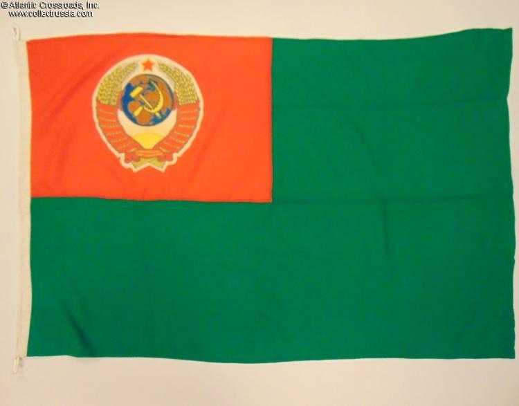 In wool bunting. Medium size, 56" long x 35" wide (approx. 4.5' x 3'). Features a green field, the color of KGB Naval Border Guards. Unlike the regular Naval Border Guard flag, the upper left corner is red with the Soviet state emblem - the kind of flag used exclusively by the Chairman of the KGB. The hoist sleeve shows manufacturer's stamp of the Vladimirskya Factory and the GOST standard mark indicating that the pattern was authorized in 1981.