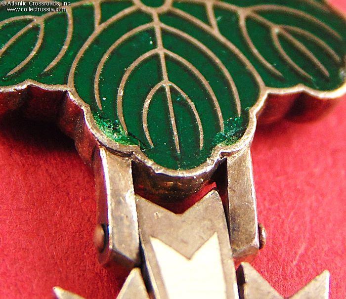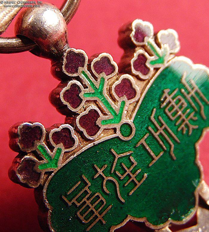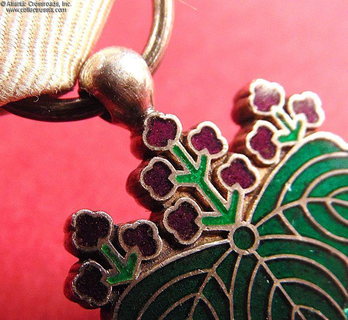 Silver, enamels and glass, 71.5 mm in height (incl. eyelet), 46.6 mm in width. Suspended on a paulownia crest of green leaves and purple flowers (3+5+3 flowers for the 6th class), veined on the obverse, and inscribed on the reverse with characters meaning "order of merit decoration". The paulownia crest is suspended from a jump ring connected to the suspension ribbon. The ribbon is in champagne-colored moiré silk with 5mm-wide red edges, less common than the regulation white with red edges.