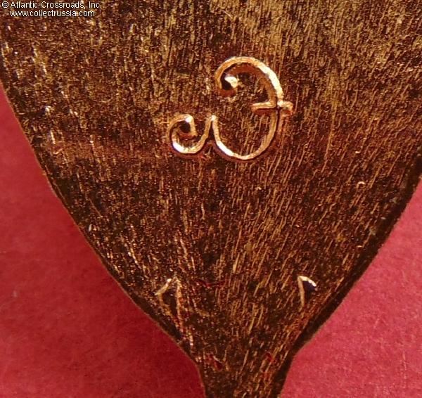 Aluminum, paint, lacquer, 43.1 x 21.4 mm. The reverse shows raised stylized letters ЛЭ ("LE"), the late-Soviet era logo of the Lenemalyer Factory in Leningrad. In excellent condition.