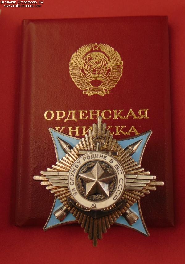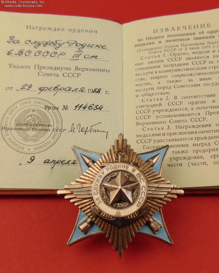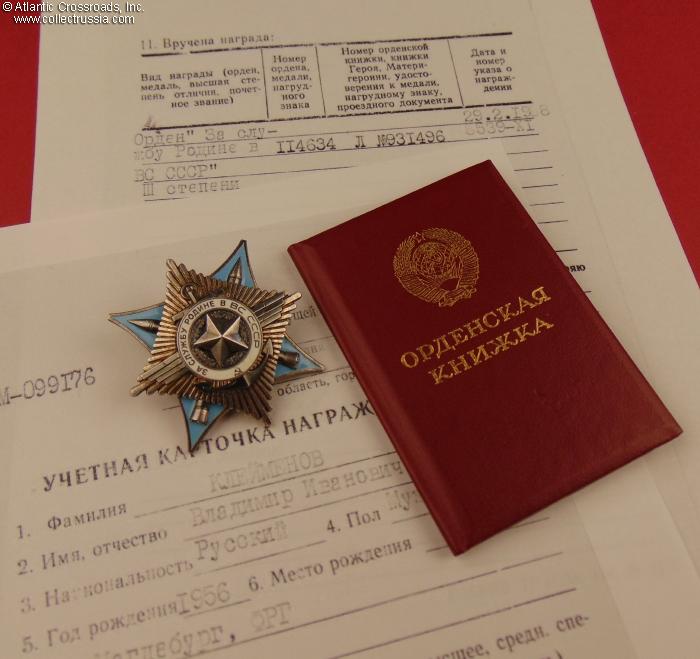 Order for Service to the Homeland in the Soviet Armed Forces, 3rd class, #114634, with award document, awarded on 29 February 1988 to Major Vladimir Kleymenov (Владимир Иванович Клейменов), Chief of Radio Electronic Warfare, 911th Fighter-Bomber Regiment.