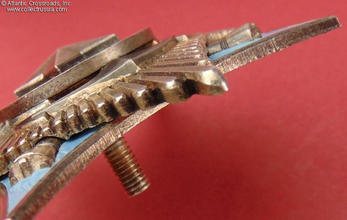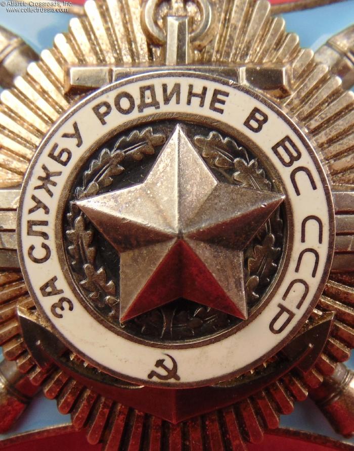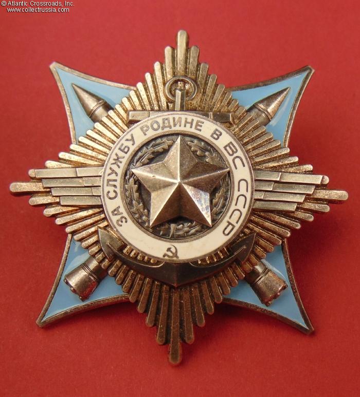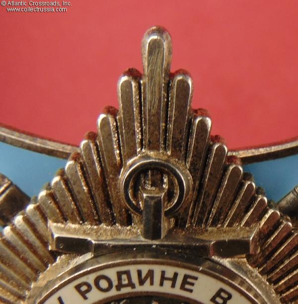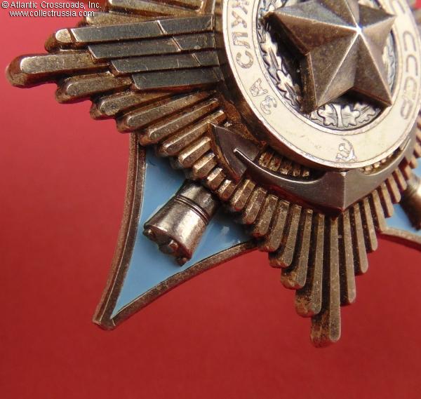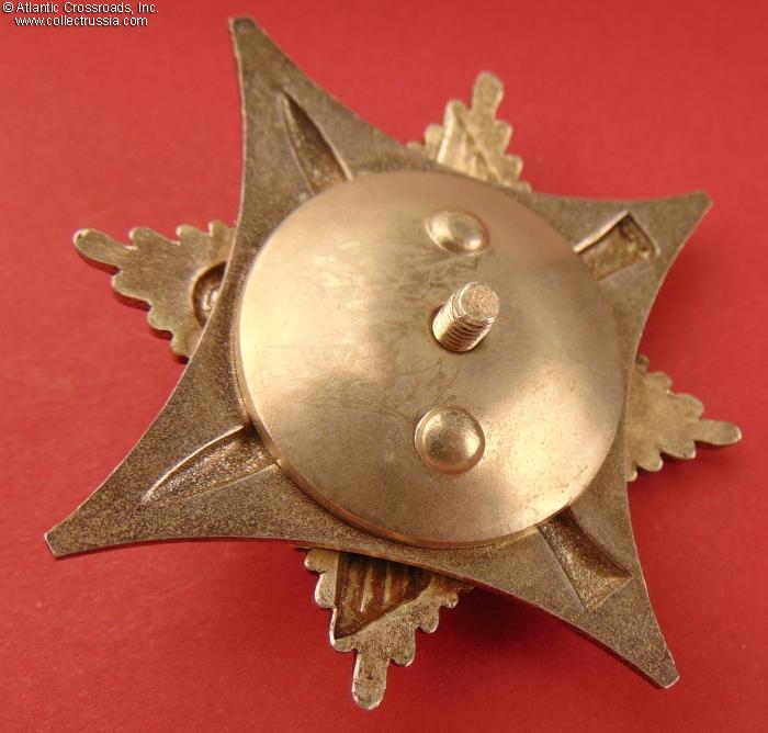The order is in silver and enamels; measures 58.2 x 58.2 mm; weighs 63.0 g without the screw plate. Massive multi-piece construction: the center star, center medallion disc, and silver starburst are separate parts superimposed on the four-sided blue star. A late version featuring the reverse with characteristically "slim" tips of the horizontal rays of the starburst (as opposed to the "stubby" points on earlier issues.)