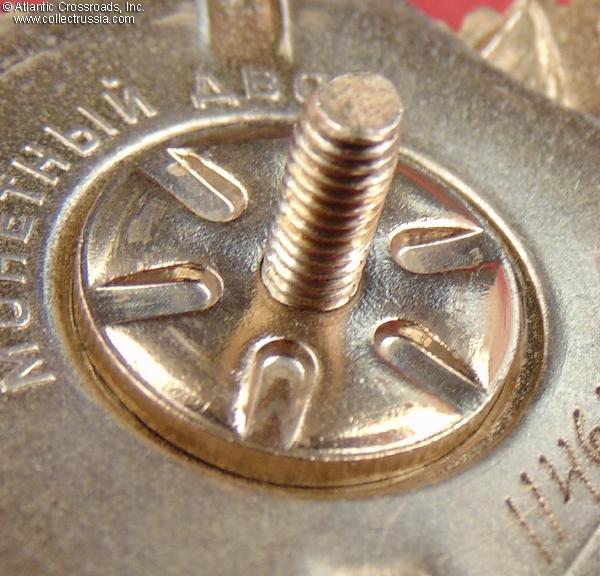 Excellent condition. The enamel is essentially perfect, completely free of the typical flaking near the tips of the rockets or any other wear visible to the naked eye; there is just a single microscopic flake to the white band at 10 o'clock and a few microscopic contact marks, all of it unnoticeable without magnification. The raised details are likewise nearly pristine, having only a barely detectable wear to the apex and ridges of the star. The factory-applied dark silver finish on the wings and anchor is perfect. The screw post is full length, approx. 9.5 mm long measured from the round retaining nut, and includes an original screw plate.