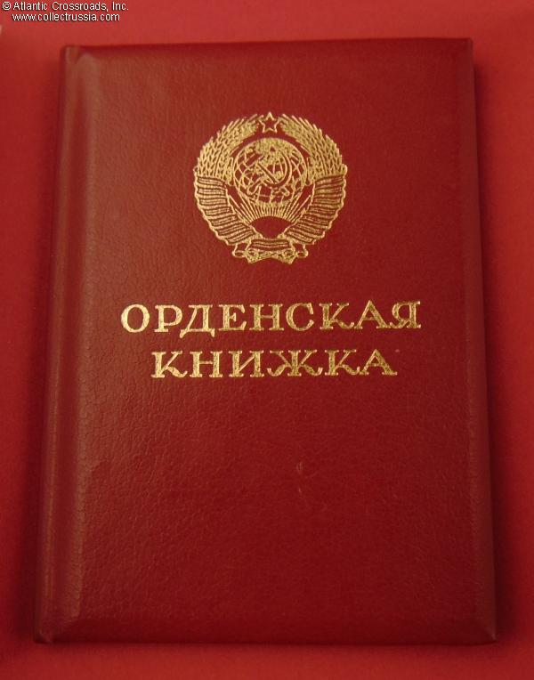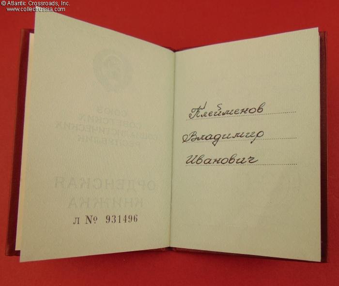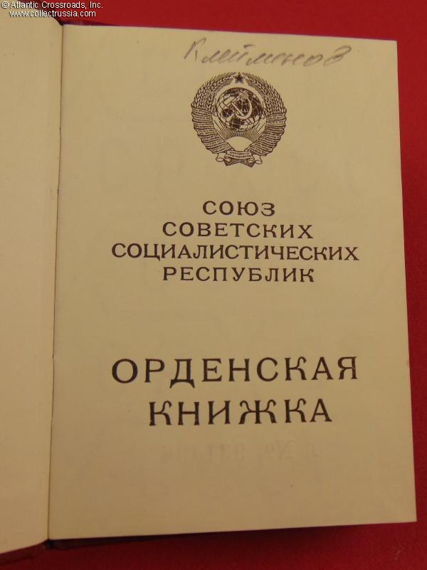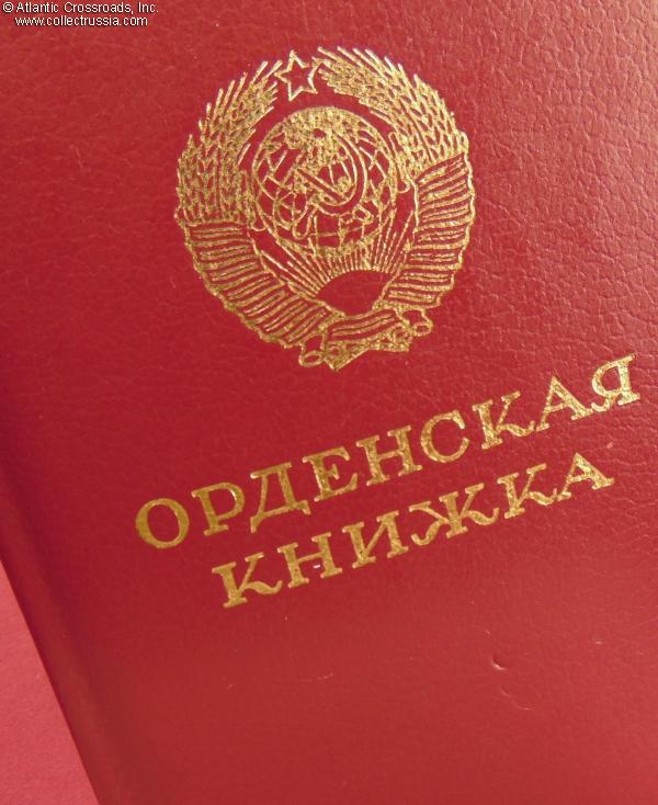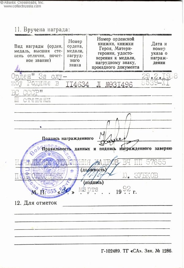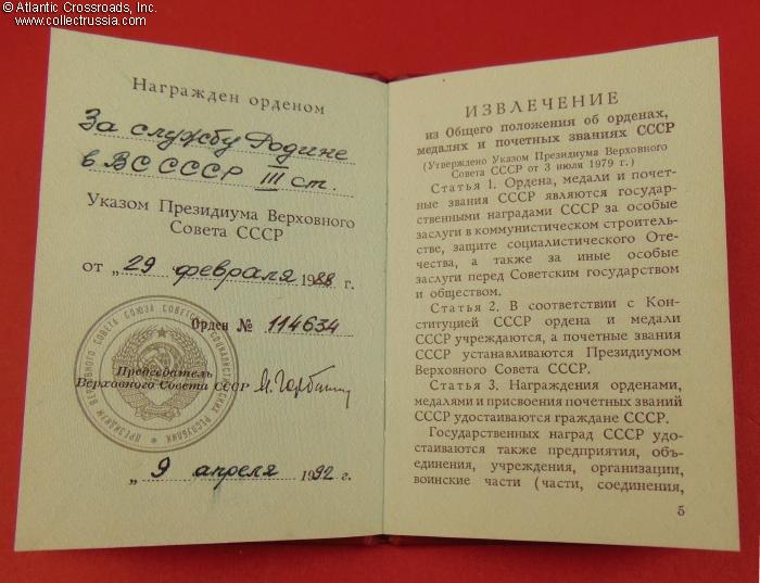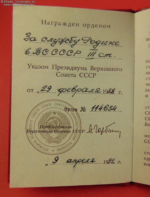 The Order Booklet (Series L) #931496 was filled-out on 9 April 1992 and shows only one decoration, the Order for Service to Homeland bestowed on 29 February 1988. Note the unusually late issue date of the document, several months after the collapse of the USSR in Dec. 1991. At the time, the new Russian Federation documents had not yet been printed and the available stock of Soviet-era documents was used instead. Interestingly, the document is not even the last Soviet version: the typographically printed text next to Mikhail Gorbachev's facsimile signature refers to the Soviet premier as the Chairman of the Supreme Soviet (his last official position was President of the USSR).