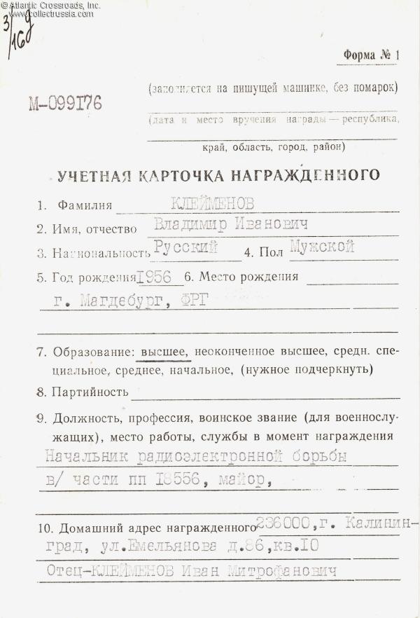By March 1992, Kelymenov had been transferred to the Military Unit #57655 stationed in Kaliningrad (former Koenigsberg). Nothing else could be found at this time about his military career prior to receiving the decoration, but more details may come to light with the gradual opening of Soviet-era archives.