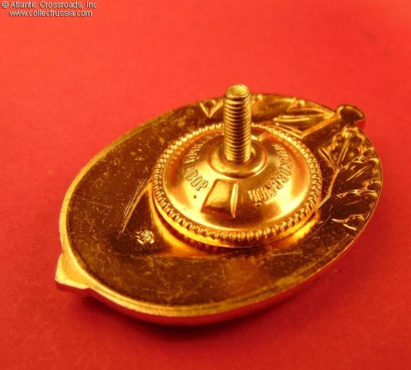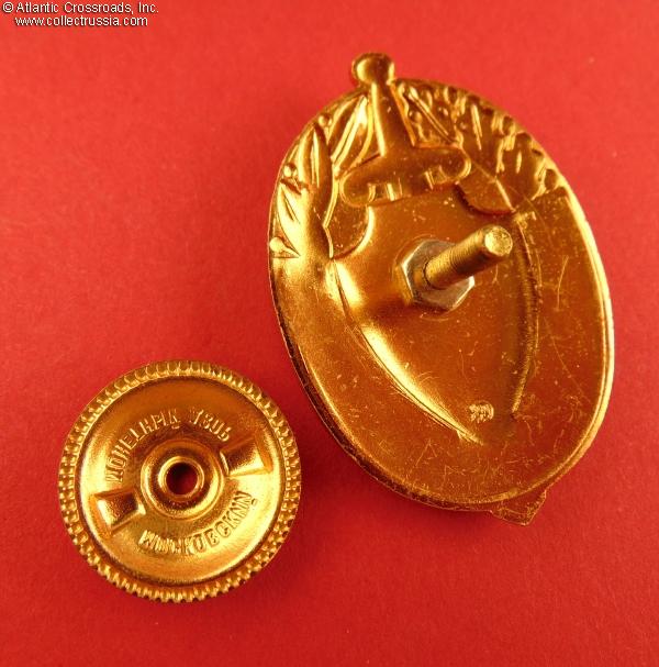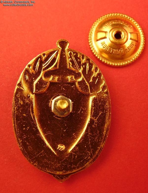 Brass gilt, enamel, lacquer; 43.8 x 30.1 mm. Fine quality two-piece construction badge with the Soviet state seal superimposed on a shield and sword emblem. Raised Moscow Mint logo to the reverse.