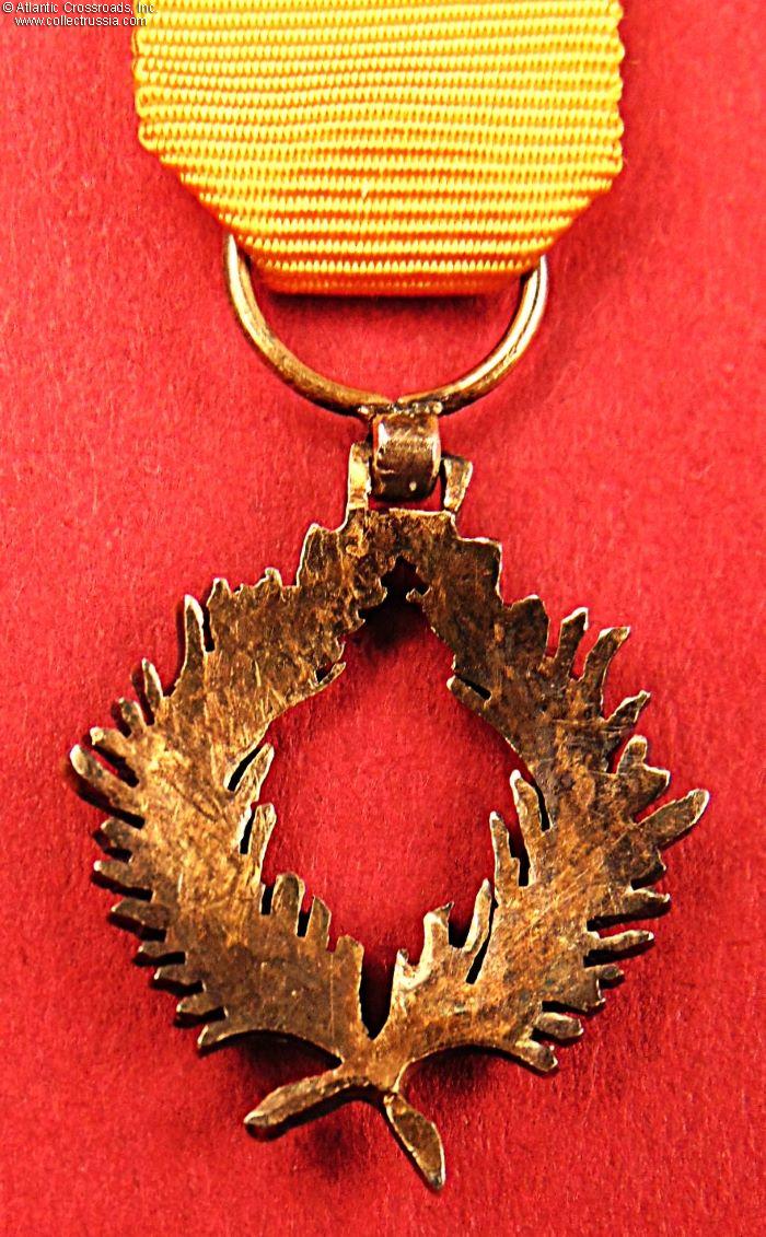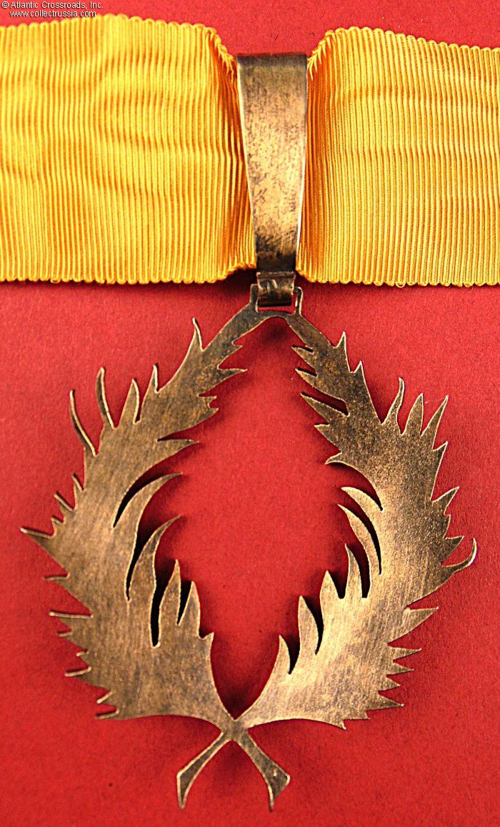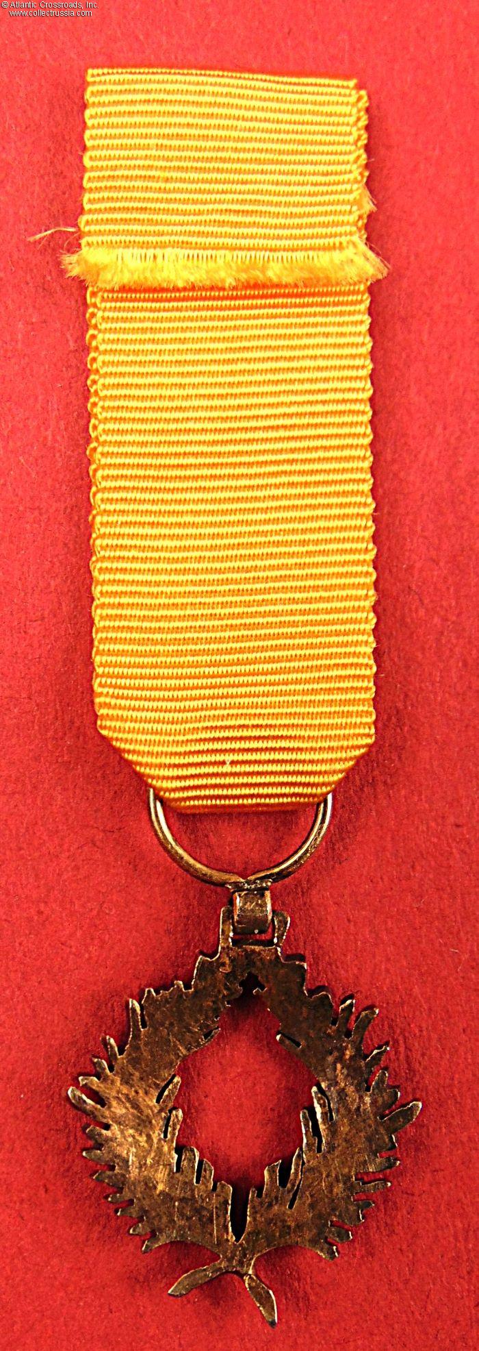 Miniature with ribbon. Silver gilt, 18.5 mm in height inc. eyelet, 16.0 mm in width, weighs 1.5 g. Suspended from a 11.6mm-wide ribbon in golden yellow moiré silk. In excellent condition.