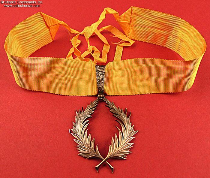 Neck badge with ribbon. Silver gilt, 61.0 mm in height (incl. eyelet bar), 51.9 mm in width, weighs 18.0 g. The suspension loop is 30.0 mm in height. The ribbon is in golden yellow moiré silk with silk ties. Excellent condition. The badge and suspension loop are free of any wear or damage visible to the naked eye. The neck ribbon is impeccably clean.