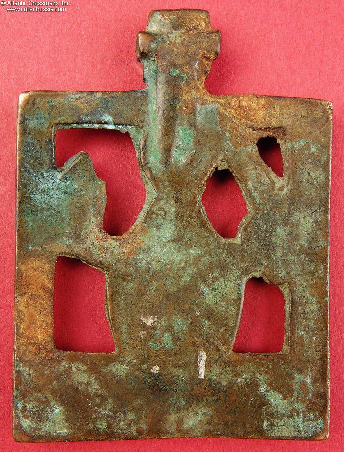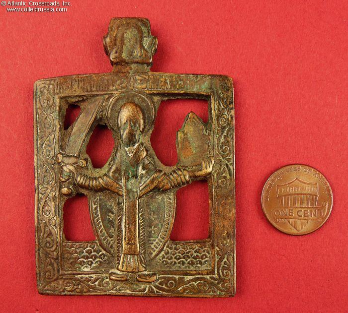 In bronze, 3" in height (incl. suspension) x 2" in width, weighs a little over 2 oz. The icon portrays one of the most venerated saints in the Russian Old Believers' pantheon, Saint Nicholas, patron of the persecuted.