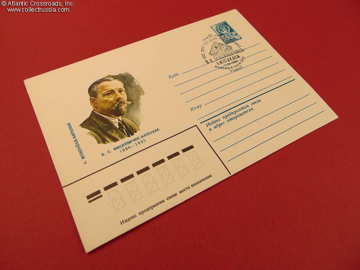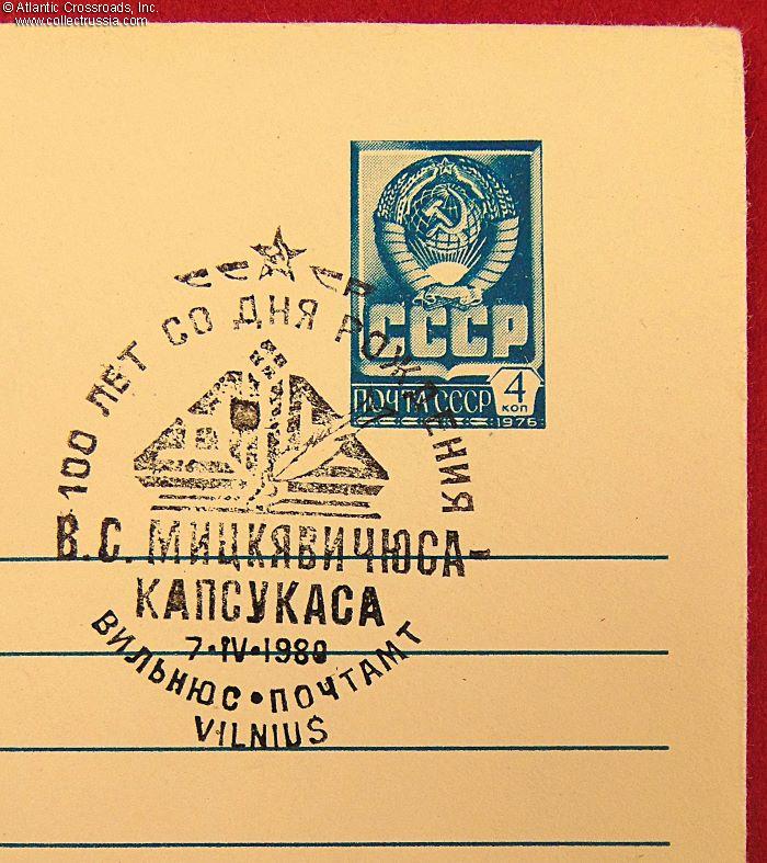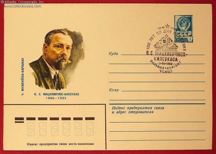 The size is 6 ¼" x 4 ½", postally unused, published by the Ministry of Communications of the USSR, circulation unknown. The pre-printed postal stamp is canceled with the First Day stamp issued by the Vilnius Post Office, dated 7 April 1980. The artwork in the left panel of the obverse was done by S. Prisekin; the artist's name is printed on the bottom flap on the verso. Vincas Mickevicius-Kapsukas (1880 - 1935) was a communist political activist, publicist and revolutionary, the first Chairman of the Council of People's Commissars of the Lithuanian SSR in 1918-1919.