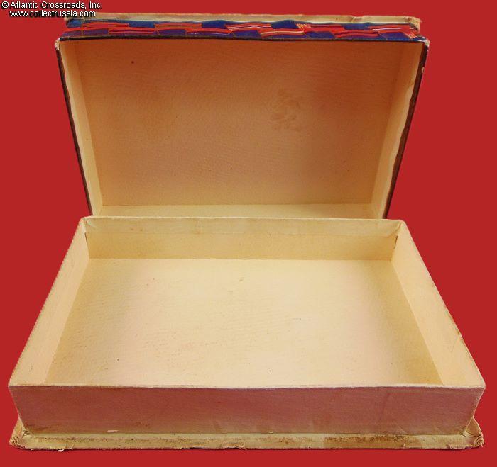 In laminated cardboard, measures 5 ¼" in width, 8" in length, 1 ½" in height. The laminate on the sides of the box consists of two lengths, each featuring the 15 flags of the Soviet socialist republics.