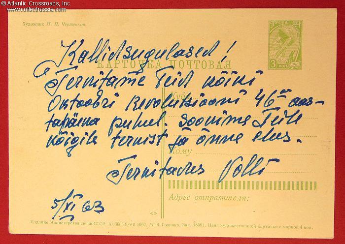 The size is continental 6" x 4", postally unused, with pre-printed postal stamp. Published by the Ministry of Communications of the USSR, circulation unknown. The obverse features the image of a monument to Lenin against the background of the Smolny, the Bolsheviks' Petrograd HQ during the October revolution and the Monument to the Conquerors of Space in Moscow. The name of the artist, N. Chertenkov, is printed in the upper left-hand corner on the verso. The handwritten inscription in Estonian language is rather enigmatic. It is addressed to "dear relatives", congratulates them with the 46th anniversary of the October Revolution, then wishes them "good luck to everyone tomorrow" and finishes with "I want to be there." Knowing how little love was lost between Estonians and the Soviet regime, makes you think, doesn't it?
