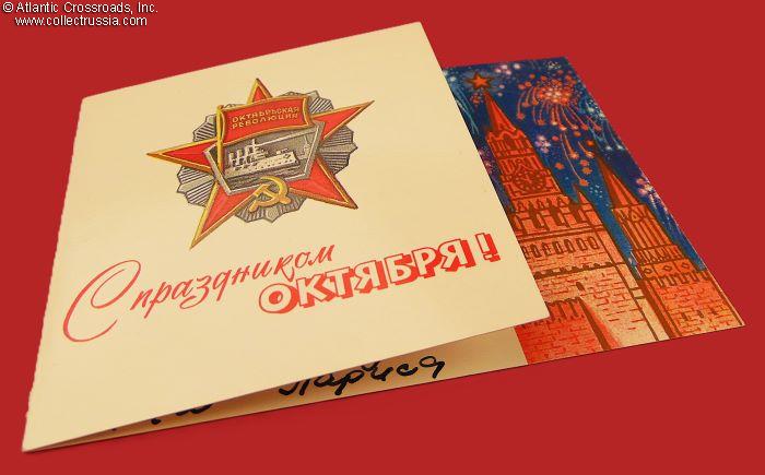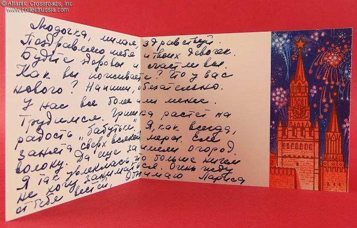 In uncommon folder format, with the front smaller than the back, total size 5" x 3 ½" when closed. Unmailable without a cover; published by the PLAKAT ("Poster") Publishing House, Moscow, circulation 1,500,000. The obverse, measuring only 3 ¼" x 3 ½" features the image of the Order of October Revolution. The inside space is decorated with a pane showing the Kremlin towers under celebratory fireworks. The inscription appears to be between friends or relatives. The author sends her best wishes, and shares her joy of caring for her grandson and her newly acquired garden plot.