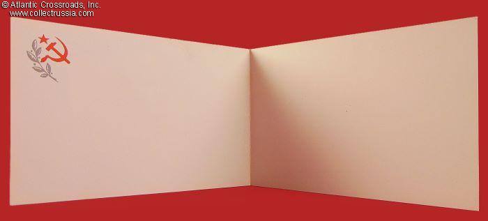 In folder format measuring standard 5 ½" x 3 ½", unmailable without a cover. Published by the PLAKAT ("Poster") Publishing House, Moscow, circulation 2,000,000. The obverse features the image of Lenin's bust by sculptor Nikolai Tomskiy - President of the Academy of Arts of the USSR, author of many a monument to Lenin. However, originality of this design stands out: Lenin's head seems to have morphed out from its gray faceless flat background, and he does not look very happy. Whatever Tomskiy meant to express by that is too late to ask: born in 1900, Tomskiy died at the ripe age of 83.