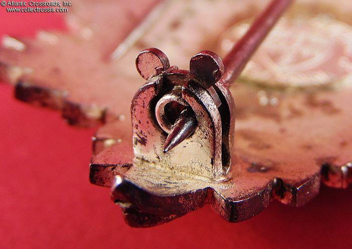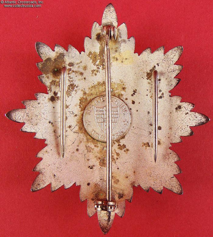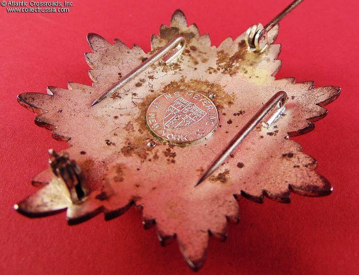 Breast Star. In silver, gold, enamel; 79.5 mm in height, 71.4 mm in width, weighs 80.7 g. The oval center medallion shows a profile bust of Simon Bolivar in gold on gilded silver background, encircled by his name in gold on blue enamel. The reverse is in unpolished silver with a round plaque with the maker's mark in the middle, showing the company's coat of arms and name, "N.S. Meyer Inc., New York." The obverse is in very fine condition, showing a couple minuscule dings to the gilt around Bolivar's bust and mild attractive patina to the tips of the silver rays. The reverse shows mild tarnish. The lock for the vertical pin is in perfect working order.